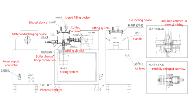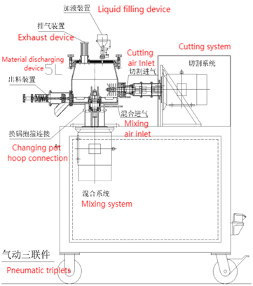 2. Kapaklı Konteyner: Konteyner ters koniktir, alt ortasına bir karıştırıcı ve yan tarafına bir granülasyon kesici yerleştirilmiştir. Üst kısım hızlı açılan bir kapağa sahiptir; hızlı açılan kapak bir kapak, kapak sabitleme kolu, kapak döndürme kolu ve silindirden oluşur. Kapak bir besleme portu, gözetleme camı ve egzoz cihazı ile donatılmıştır. Malzeme SUS304.